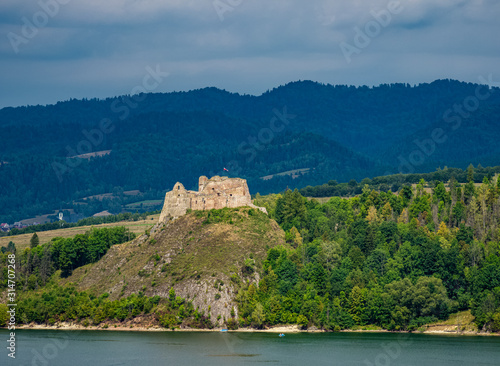 Fototapeta premium View over Lake Czorsztyn towards Czorsztyn Castle, Lesser Poland Voivodeship, Poland