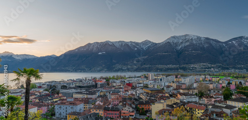Obraz premium View over Maggiore lake and Locarno town in spring sunny morning