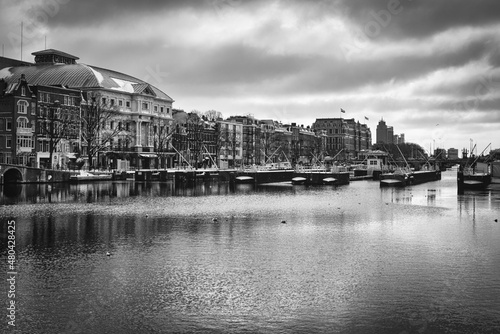 © henryopzolder, Naklejka premium View over the Amstel river in the historic city center of Amsterdam in classic Black and White