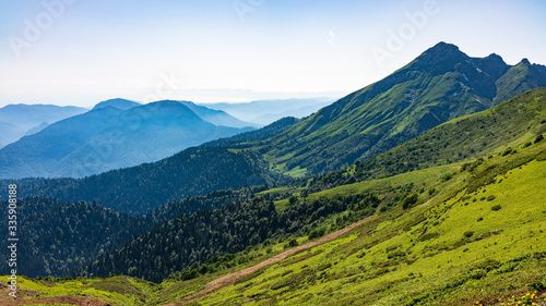 © Dmitrii Potashkin, Naklejka premium View over the Green Valley, surrounded by high mountains on a summer sunset. Layers of mountains in the haze during sunset.