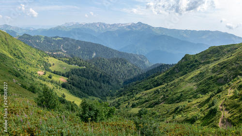 © Dmitrii Potashkin, Fototapeta premium View over the Green Valley, surrounded by mountains vyskokimi on a clear summer day. Krasnaya Polyana, Sochi, Caucasus, Russia.