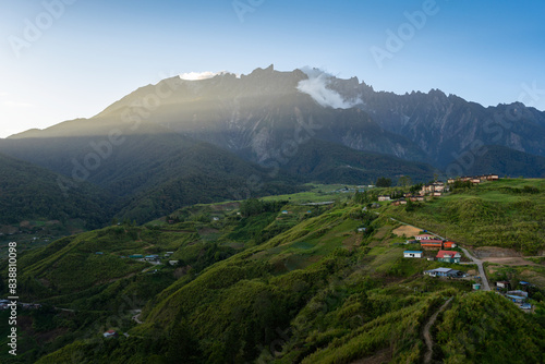 © Wirestock, Naklejka premium View over the Mount Kinabalu at sunset in Borneo and Malaysia