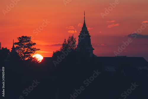 Fototapeta premium View over the temples of Chaiyaphum in Thailand to the surrounding mountains at sunset