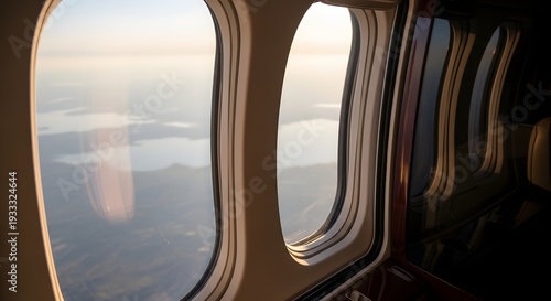 Fototapeta premium View through airplane window at sunset over clouds and water