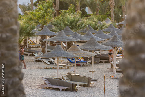 Obraz premium view through palm trees to many beach umbrellas at the sea