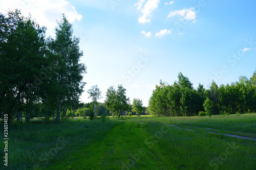 © YAROSLOVEPHOTOVIDEO, Naklejka premium View through the green field to the forest in the distance.