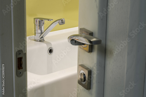 © Cliff, Obraz premium View through the open door to the faucet on the washbasin in the bathroom