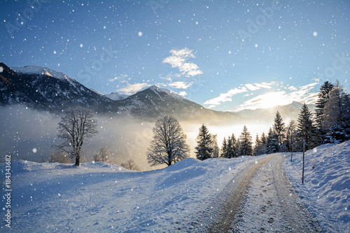 Naklejka premium View to a icy road with snowfall and mountain range of Gasteinertal valley...