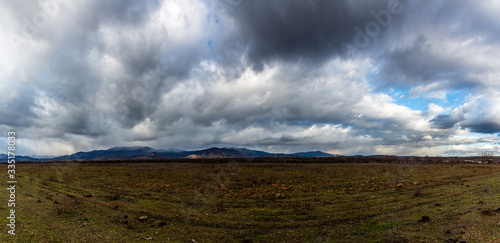 © rninov, Fototapeta premium View to mountain and field with dramatic cloudy sky