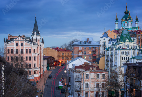 Fototapeta premium View to Old District Podil of Kyiv city from Zamkova Hill at sunset.