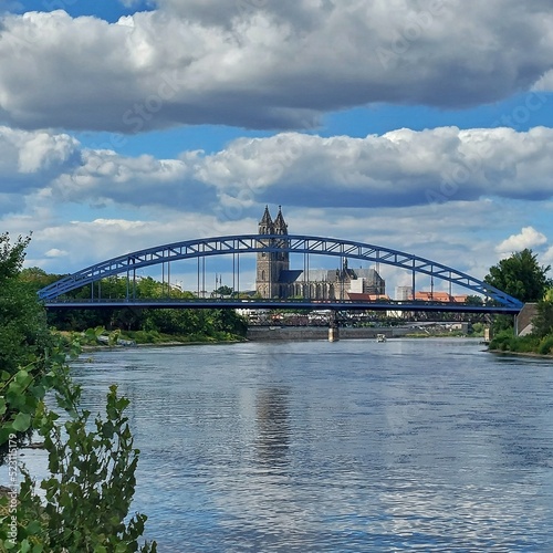 © jojoo64, Fototapeta premium View to the city of Magdeburg, with the Sternbruecke (lit. star bridge) and the cathedral