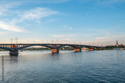 © travelview, Obraz premium view to Theodor Heuss bridge in Mainz in sunset mood