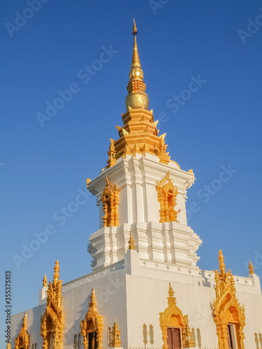 Naklejka premium view top of white Chedi (pagoda) Tian Yok with blue sky background, Wat Phumi...