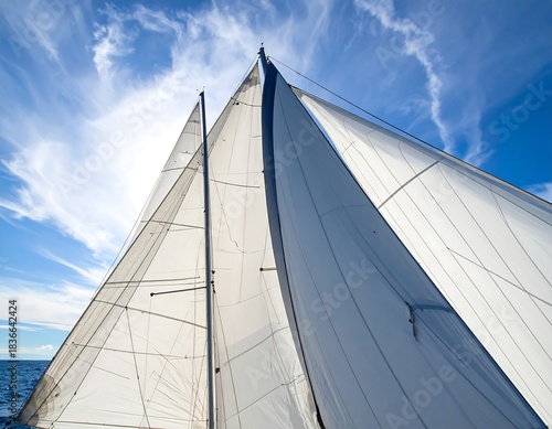 © Lala, Obraz premium View upward of a sailboat's billowing sails, bright blue sky