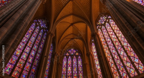 © kukuruyuk, Fototapeta premium Viewing Stained Glass Windows in Gothic Architecture Ceiling