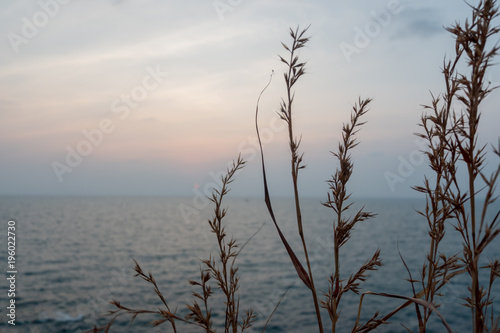 © Wintakorn, Fototapeta premium Viewpoint hill with sea blue sky and grass flowers in the front