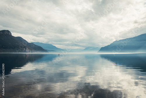© Sylvain, Fototapeta premium viewpoint over Lake Bourget in winter, on Chindrieux beach in Savoie