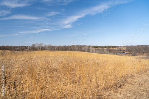 Fototapeta premium Views of dried prairie and trees during a sunny spring day at a MN state park.