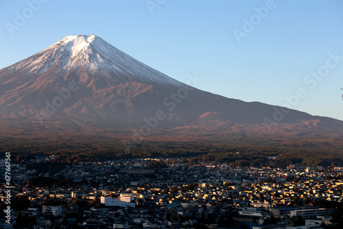 Fototapeta premium Views of Mount Fuji at dawn from the Chureito Pagoda temple in Fujiyoshida,...