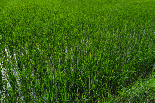© Aidil Diafragma, Obraz premium Views of neatly lined rice fields, creating a peaceful and beautiful atmosphere