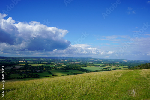 © Robert, Fototapeta premium Views over countryside farm fields with clouds in blue sky in the summer