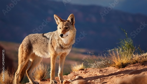 © netsay, Obraz premium Vigilant Coyote amidst the Winter Wilderness Frostcovered Landscape, Glistening with Sunlight and Silent Mystery in a Snowy Mountain Scene