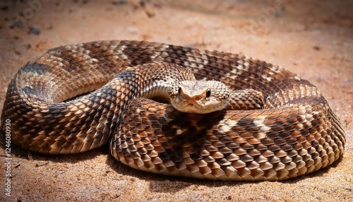 Obraz premium Vigilant Western Diamondback Rattlesnake in Desert Dusk, Coiled and Ready...