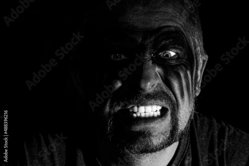© Emvats, Fototapeta premium Viking man with a furious gaze and a painted face looks into the darkness with bright eyes