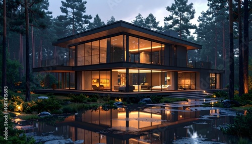 Obraz premium Villa moderna de lujo con grandes ventanales y reflejo en lago al anochecer