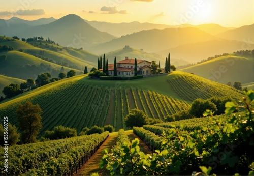© Cozy Coffee Bar, Naklejka premium Villa on Hilltop Vineyard at Sunset