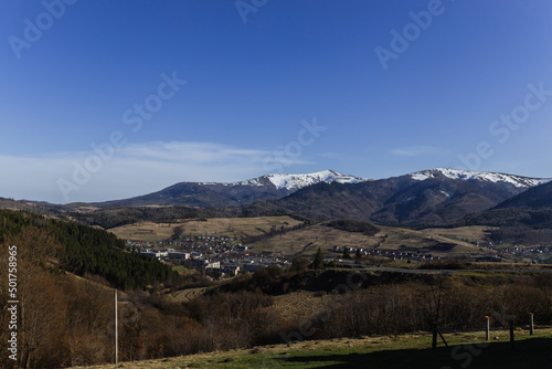 Naklejka premium Village and mountains with blue sky at background.
