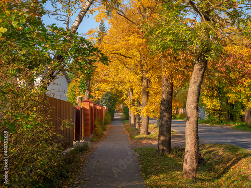 © sablinstanislav, Naklejka premium Village in autumn. Russian village road. Sidewalk in the summer village in the fall