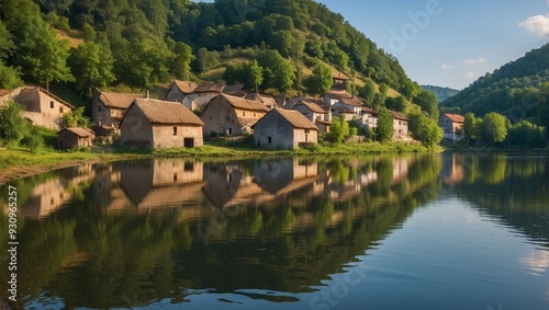 © arif, Fototapeta premium village in the mountains and reflection of shadow in water, scenic view in spring