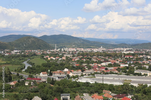 © Liudmyla Leshchynets, Fototapeta premium village in the mountains. Scenic view of the town in the mountains on a cloudy summer day.