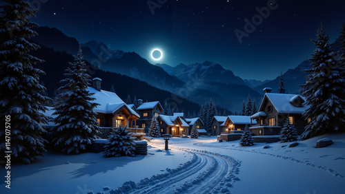 © Gregorek, Fototapeta premium Village in the mountans, winter landscape in the mountains. Night.