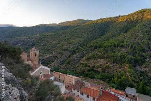 © porqueno, Obraz premium Village nestled in a green, sunlit mountain valley.