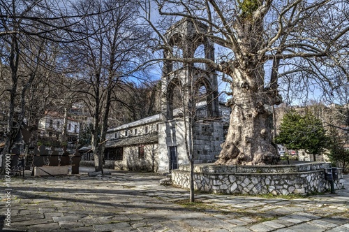 © Stamatios, Naklejka premium Village of Kissos in Pelion, main square on a winter monring