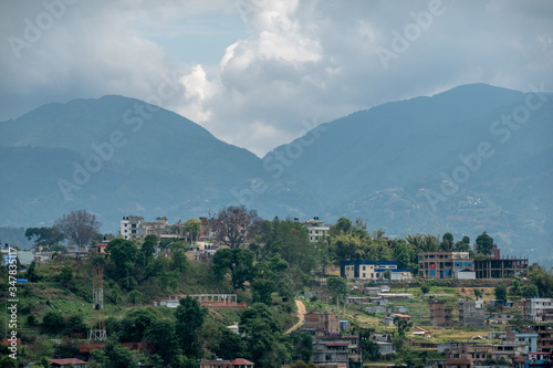 Obraz premium Village on a Hilltop Surrounded by Mountains
