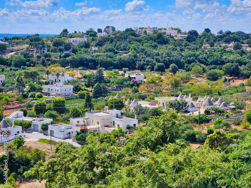 Fototapeta premium Village on the side of the mountain surrounded by trees. Aerial drone photo....