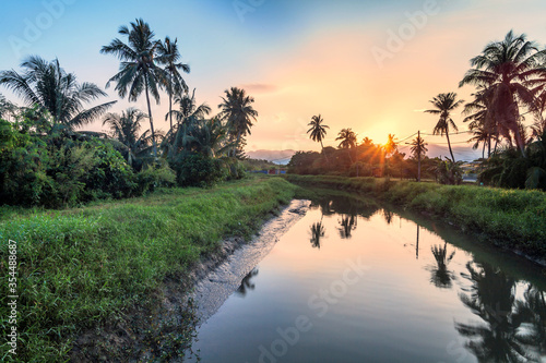 © keongdagreat, Obraz premium Village river reflection of sunrise view in Balik Pulau, Penang