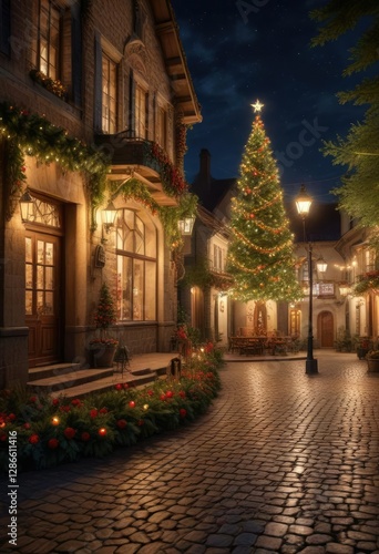 Fototapeta premium Village square at night with festive decorations and a Christmas tree, tree, decorations, village