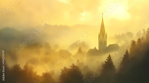 © Thiago, Fototapeta premium Village veiled in morning fog, the church spire a beacon amidst the soft golden light. Spire. Illustration