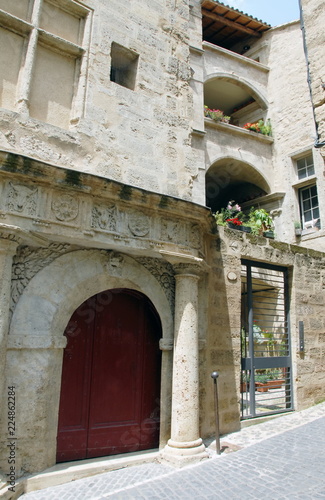 Naklejka premium Ville de Pézenas, vieille façade et porche sculpté, balcons couverts,...