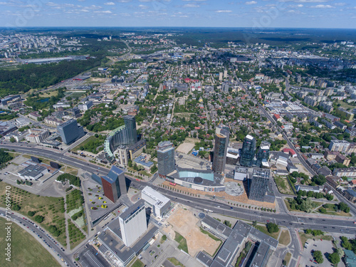 © Mindaugas Dulinskas, Fototapeta premium Vilnius City Cityscape, Lithuania. Business Town in Background. Drone Point of View. Snipiskes District