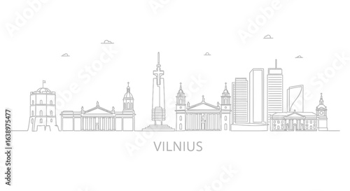 © gapaparis, Naklejka premium Vilnius Skyline: A minimalistic line art illustration of the Vilnius skyline, showcasing iconic landmarks.
