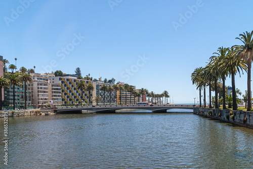Obraz premium Vina Del Mar, Chile - December 8, 2008: Landscape of South Shore of the estuary with luxury tall buildings and row of mature palm trees under blue sky. Bridge with bus.