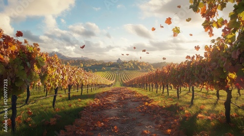 Naklejka premium Vine leaves fall on dirt path thru vineyard toward a distant building, under...