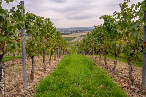 © Bildgigant, Fototapeta premium Vine plants in a row on a vineyard after harvest in september, view mountain peak, cloudy day