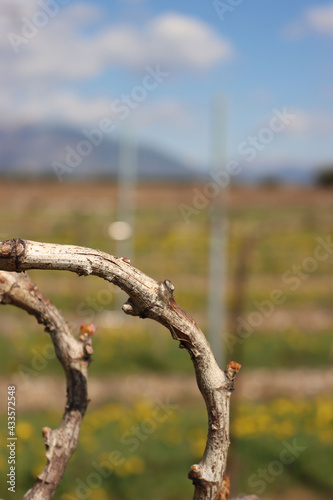 Fototapeta premium Vine plants with fresh new buds on springtime on a sunny day. Close-up of Vitis vinifera