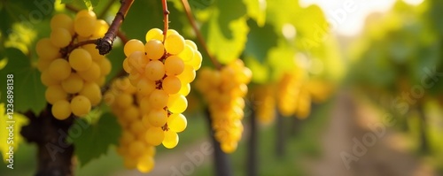 © Sarayuth, Fototapeta premium Vine with golden Riesling grapes suspended above the ground, gold, grapes